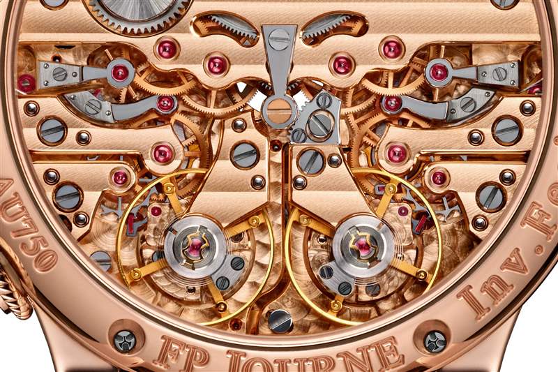 2020款JOURNE CHRONOMèTRE à RéSONANCE的兩列行駛列車,擒縱機構和天平,配有雙瑞士杠桿式擒縱機構。