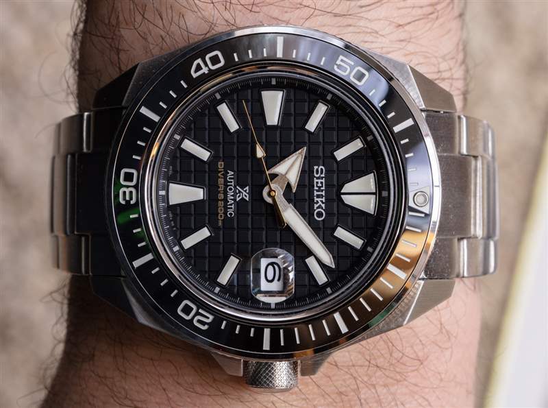 精工專有的 Lumibrite 提供出色的黑暗視覺效果,而整個 King Samurai 表盤非常清晰易讀(即使我希望指針稍微長一點)。藍寶石水晶的底面有 AR 涂層,鑒于其扁平的形狀,幾乎不會產(chǎn)生眩光。44m 寬,King Samurai 也不是一只小手表,但它非常舒適,尤其是在表帶上。精工的表鏈和表帶選項既耐用又保守,但多年來,手表愛好者已經(jīng)改進并進一步個性化了精工潛水表的外觀,將它們放在一系列可用的第三方表帶上。為了使這些 King Samurai 手表脫穎而出,我當然建議買家考慮這樣做。