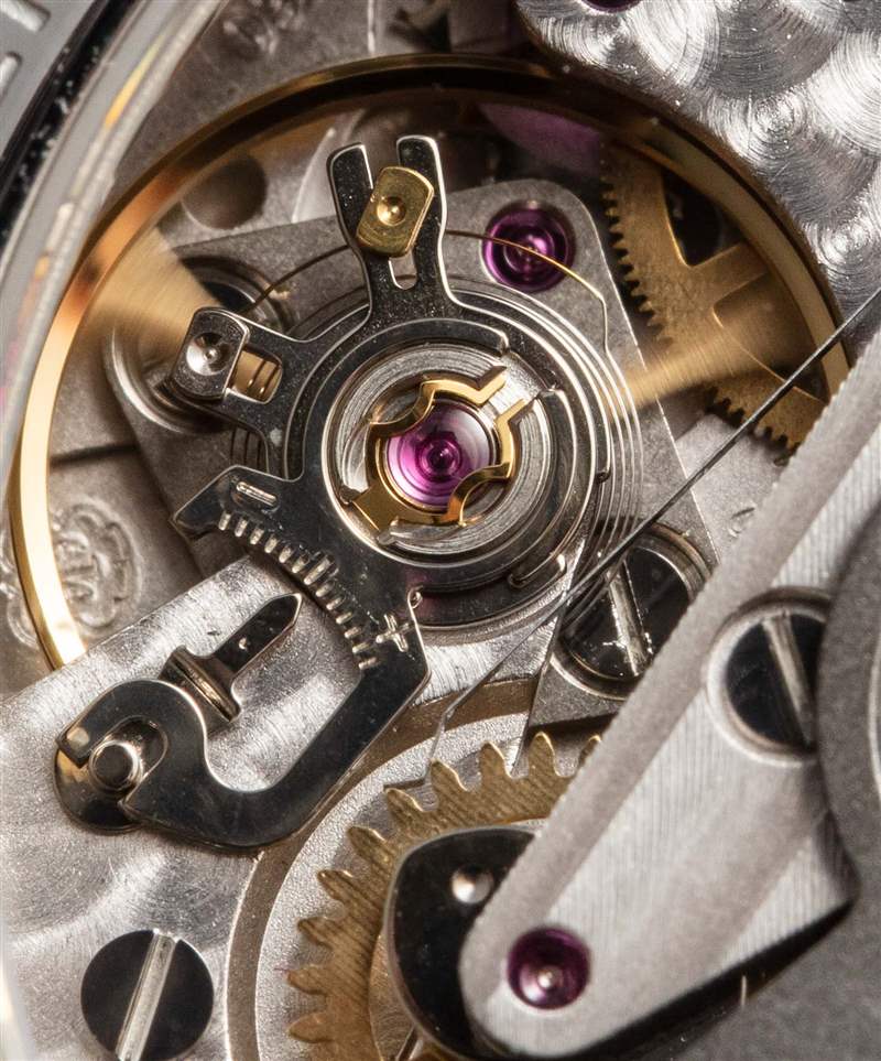 基本上,為了調整日歷,你必須向前調整它。該模塊的原理是兩個同心日期輪,連同必要的齒輪,在表盤上提供月份和日期的兩個窗口。這些窗口不是在兩個平面上,而是彼此水平,但一個窗口(月份)放置在非常靠近表盤上的中央指針軸點的位置。假設我以前沒有見過這種特殊的配置。計時碼表上部小表盤上 15 分鐘位置的右側是一個小的 AM/PM(日/夜)指示窗口。它從黑色變為白色(反之亦然),時間從上午變為下午,坦率地說,我非常喜歡這種復雜性。