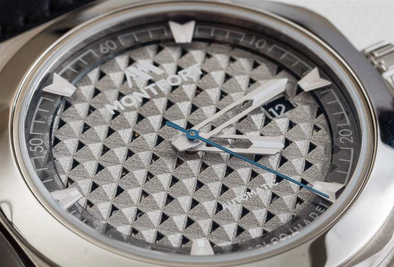 從易讀性的角度來看,表盤上只有 12 個時標,這有點奇怪。從對稱的角度來看,這看起來很酷,但容易讀懂需要一點習慣。Montfort 正確地為大多數(shù)指針和時標使用了啞光緞面處理——只使用了一點點發(fā)光體就可以很好地測量。顏色通過藍色 PVD ??涂層秒針提供。這實際上是通過 PVD ??應(yīng)用程序看到藍色秒針而不是經(jīng)過熱處理、涂漆或電鍍的罕見實例。日期窗口(正確使用黑色圓盤)在 3 點鐘位置可見。