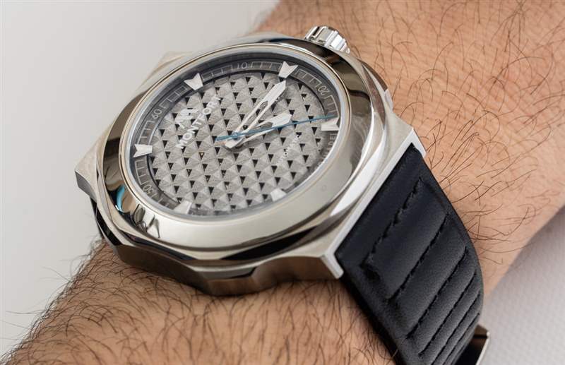 Montfort 自豪地用“超級不銹鋼”制作 Strata 的 44 毫米寬表殼。這是他們對一種特殊硬化鋼的名稱,這種鋼的表面密度比其他標準鋼表更高。實際結(jié)果是表殼比類似的鋼表更耐刮擦。表殼的磨損比它可能暗示的 44 毫米寬尺寸要小一些,這是因為它的厚度剛剛超過 10 毫米,以及相對較短的(寬度)47 毫米的凸耳到凸耳的距離。此外,由于表耳的樣式,折疊的地方?jīng)]有長長的“角”伸出。