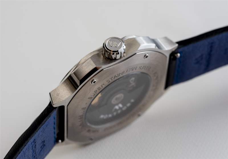 說到表帶,Montfort 使用了一條漂亮的意大利制造的絎縫黑色皮革表帶,內(nèi)側(cè)帶有藍色(在這款手表上)Lorica 襯里。回到這個案例,我發(fā)現(xiàn)它做工精良,而且看起來很有趣。雖然案例風格當然不適合所有人,但我相信沒有人可以指責它很無聊。雖然我佩戴這款手表的時間不長,但我相信 Strata 表殼設(shè)計肯定會隨著時間的推移而成長。表殼進一步防水 100 米,并在表盤上具有 AR 涂層藍寶石水晶。另一個藍寶石水晶放置在手表后部顯示的機芯上方。