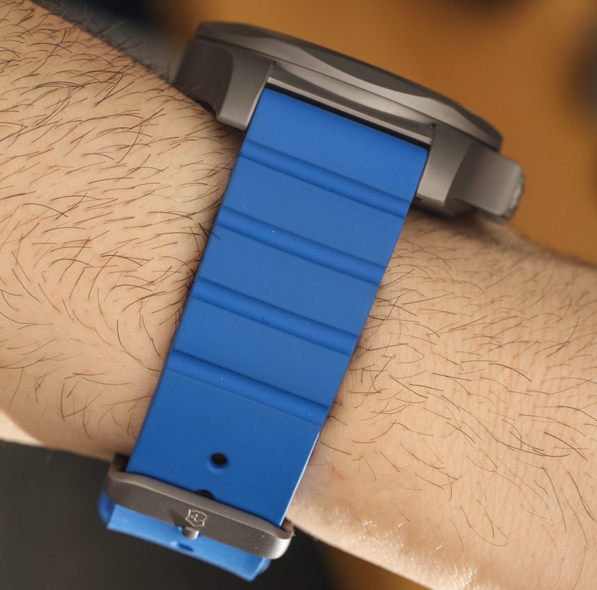 與標準 INOX 的拉絲和拋光鋼表殼不同,Victorinox Swiss Army 采用全噴砂處理鈦金屬表殼。我有一種感覺,這是 2 級和 5 級鈦金屬,這實際上很有趣,因為 INOX 式表殼的清晰角度和精確曲線做得非常好。與鋼相比,鈦的灰色外觀也在設計中得到了強調。此外,表殼的啞光處理流向表盤,為這款生活方式運動手表帶來更加清醒、工具風格的外觀。