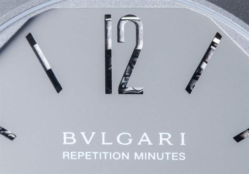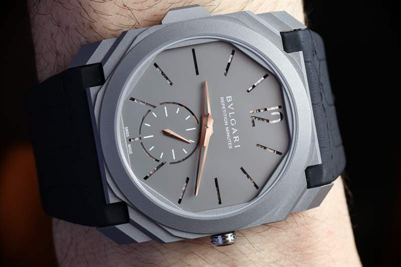 在噴砂鈦中,這種近乎工業的表面處理并不是大多數人對高端奢華手表的期望。話雖如此,鈦是用于三問報時表的最佳材料之一,因為它的特性不會減弱報時的聲音。黃金或鉑金等貴金屬是響亮的三問表的大敵,而當您想要最響亮、最清晰的聲音時,鋼和鈦是更好的選擇。寶格麗不僅將鈦用于表殼材料,還用于表盤。如果仔細觀察,您會注意到寶格麗 Octo Finissimo 三問報時腕表最有趣的設計細節之一:鏤空時標和小秒盤。這不僅僅是為了風格,而是作為幫助聲音傳播的一部分,從而充分利用內部空間讓鈴聲產生共鳴。