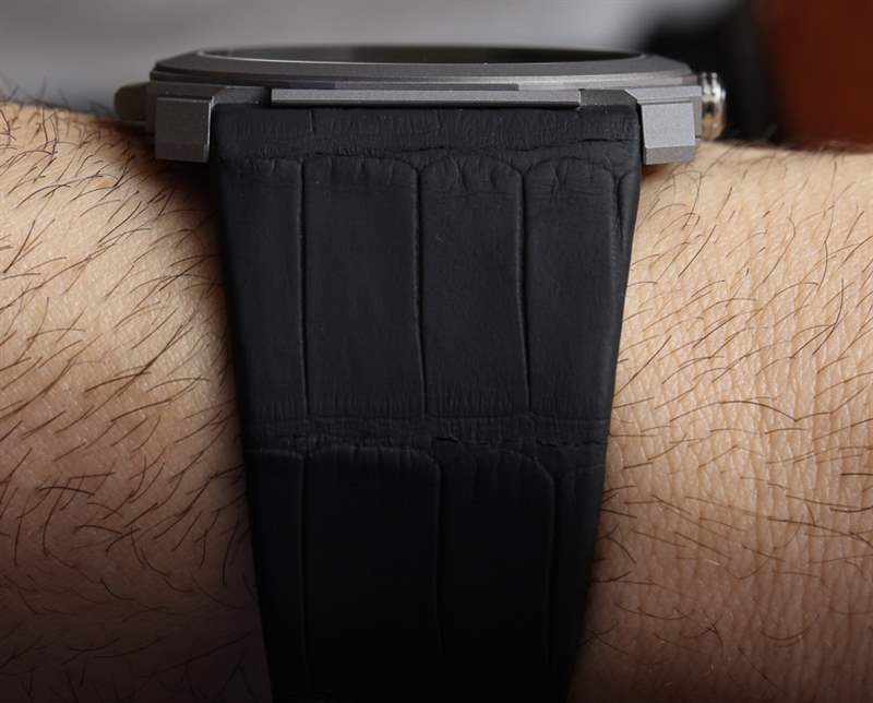 Bulgari Octo Finissimo 三問報時腕表配有啞光黑色硫化鱷魚皮表帶和折疊式鈦金屬表扣。觀看上面的視頻,了解這種美麗的聲音。