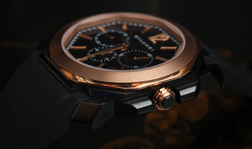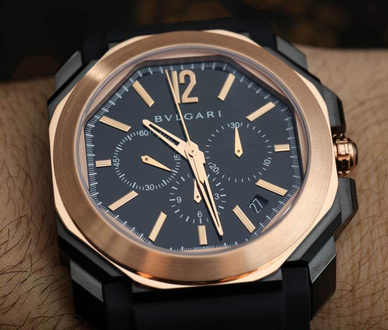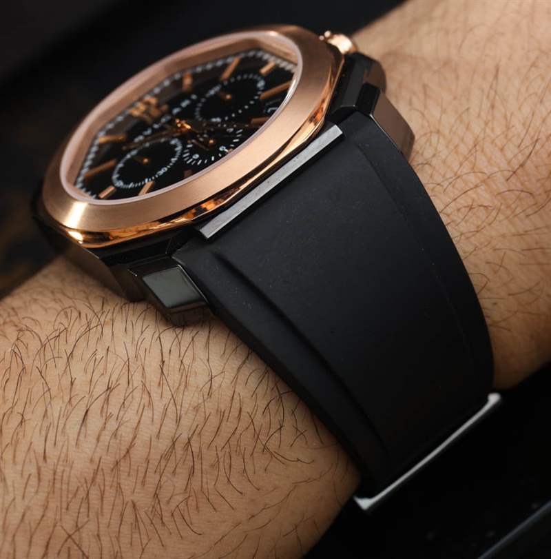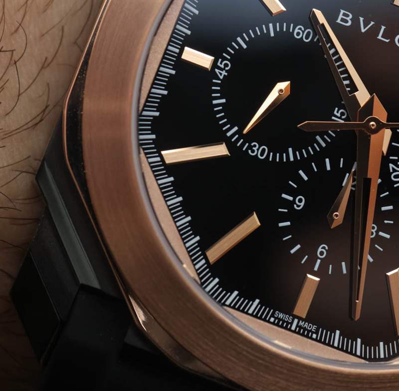 盡管增加了 18k 玫瑰金,但這可能是迄今為止最運(yùn)動(dòng)的 Octo 計(jì)時(shí)碼表之一。這在很大程度上要?dú)w功于新的錐形黑色橡膠表帶,它使手表比以往任何時(shí)候都更加舒適。此外,黑色漆面表盤與相配的玫瑰金指針和時(shí)標(biāo)形成鮮明對(duì)比,使這款寶格麗 Octo Velocissimo Ultranero 成為同類產(chǎn)品中最易讀的一款。我不會(huì)說這款手表很便宜,但采用黑色 DLC 涂層鋼和 18k 玫瑰金,它的價(jià)格確實(shí)與鋼制勞力士代托納差不多。