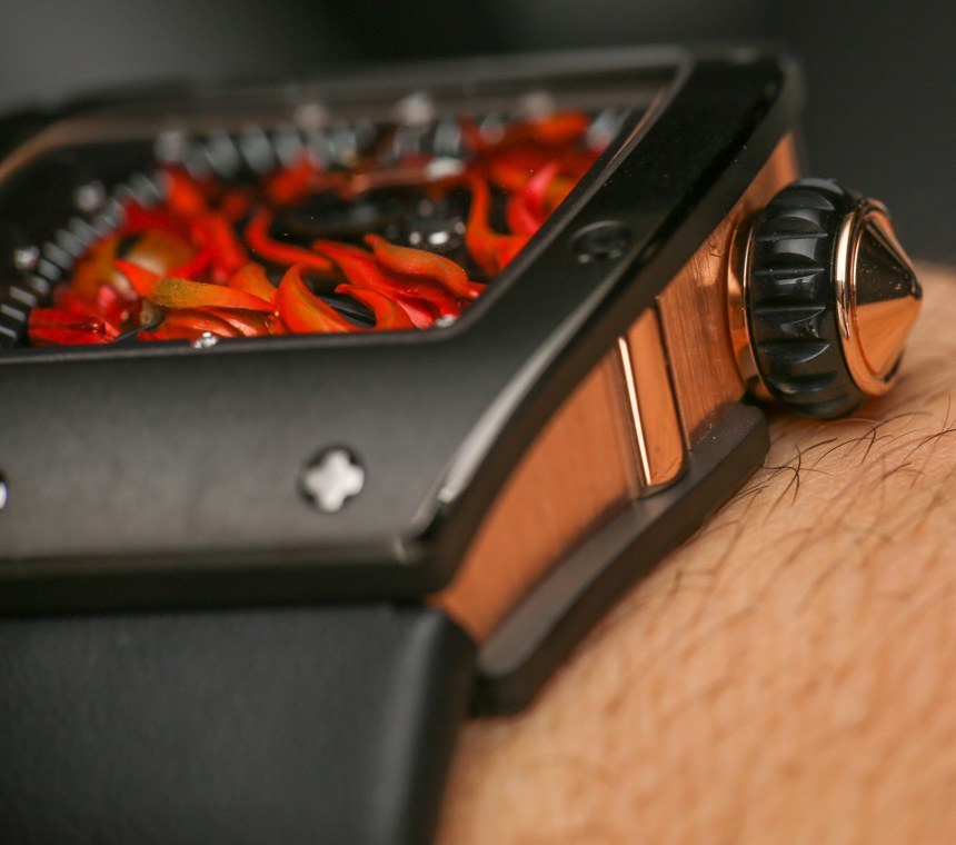 RM 26-02 表殼由 18k 紅金和黑色陶瓷制成。Richard Mille 使用經(jīng)過精細(xì)拋光和倒角邊緣的高級陶瓷。材料的組合效果很好,因?yàn)樗鼈儽舜诵纬甚r明對比,并與邪惡之眼表盤的黑暗和熾熱主題相得益彰。表殼寬約 40 毫米,高約 48 毫米,厚 13 毫米。這本身并不小,但在較小的現(xiàn)代 Richard Mille 手表中,盡管彎曲的酒桶式表殼非常舒適地包裹在手腕上。