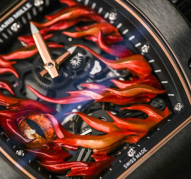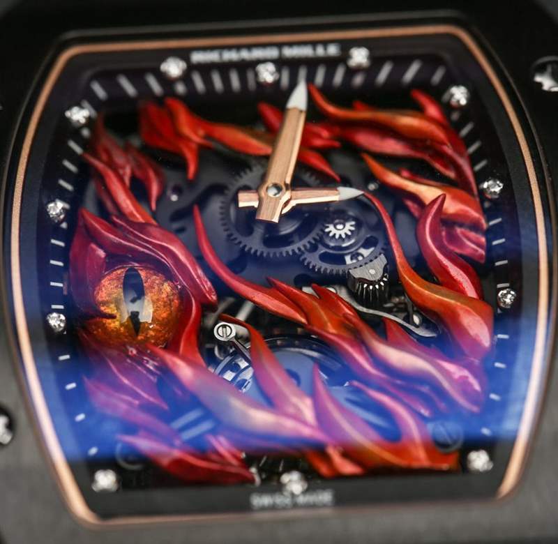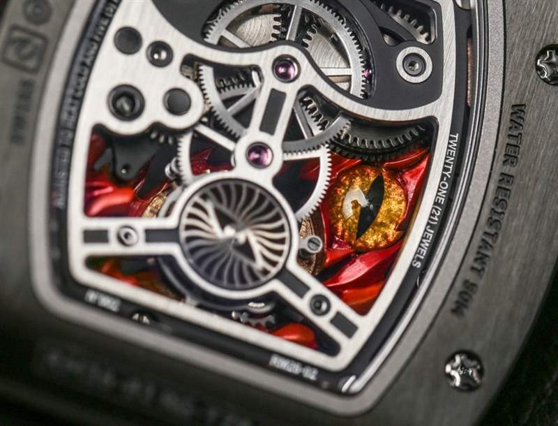 Evil Eye 本身是精心繪制的大明火琺瑯,火焰是純金,然后涂漆。這是由 Richard Mille calibre RM 26-02 手動(dòng)上鏈機(jī)芯編織而成,帶有小時(shí)、分鐘和一分鐘陀飛輪。表盤上還有一個(gè)小的動(dòng)力儲(chǔ)存指示器。3Hz 頻率機(jī)芯的最大動(dòng)力儲(chǔ)存約為 50 小時(shí),大部分機(jī)芯由鈦制成。