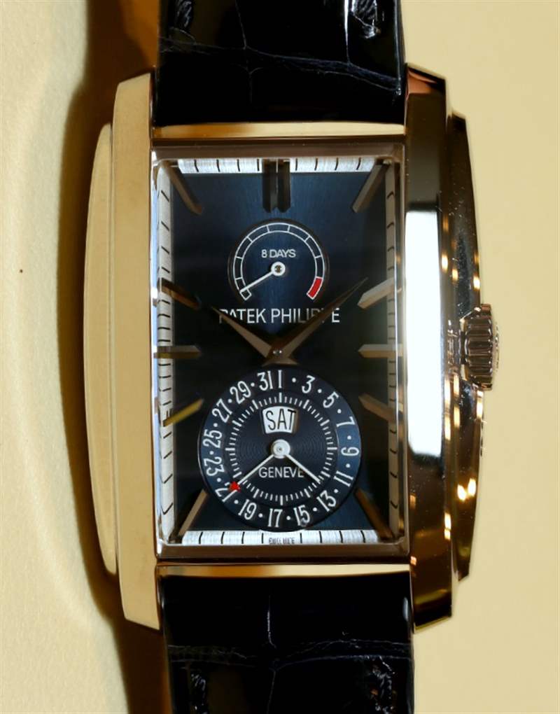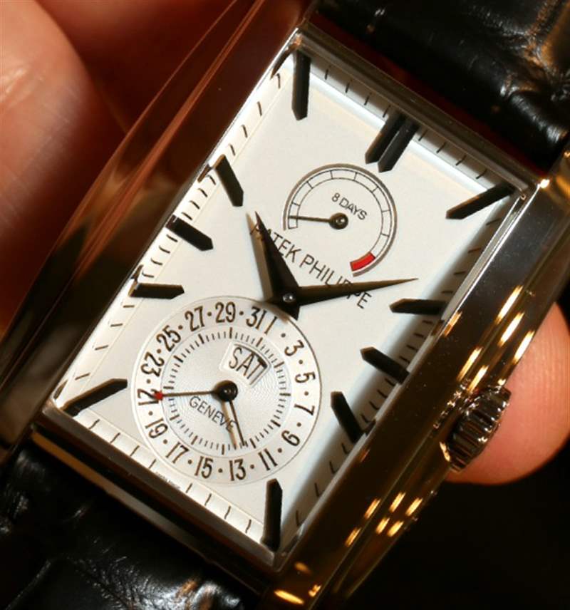 很難抗拒“啞光藍色旭日形”表盤(如百達翡麗的稱呼)的魅力,但加上拋光的太妃糖指針,在光線下的易讀性并不理想。盡管如此,盡管矩形表盤的比例令人尷尬,但就可讀性而言,百達翡麗在指針和應用時標方面做得很好?!般y白色蛋白石”表盤非常棒。非常輕,它與那些啞光黑色混合得非常好。百達翡麗是目前生產這些深黑色但細節豐富的黑色指針和時標的王者。