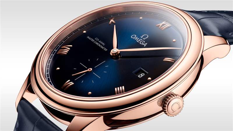 與之對應的男表選擇頗多,比如碟飛系列第三代典雅腕表41毫米,由偏紅的 Sedna 18K金制成。這是一種呈現(xiàn)熾烈色調(diào)的18K玫瑰金,同樣由歐米茄獨家研發(fā)制造,其獨特成分包括銅和鈀,以確保顏色持久和穩(wěn)定。這一新型合金的名稱源于被天文學家稱為 Sedna 的外海王星天體,Sedna 小行星被認為是太陽系中表面顏色最紅的天體之一。拱形的深藍色 PVD 表盤呈現(xiàn)出太陽射線的打磨效果,柳葉形時分指針及6點位的小秒針經(jīng) Sedna 18K 金 PVD 處理,羅馬數(shù)字刻度和弧面形小時刻度交替出現(xiàn),特別文質(zhì)彬彬。