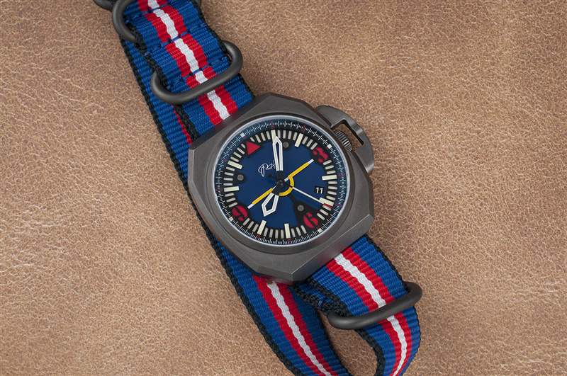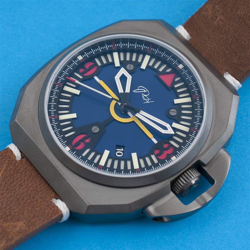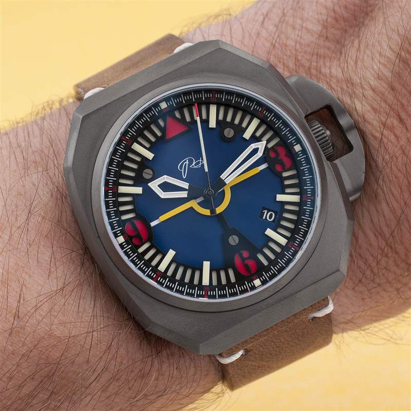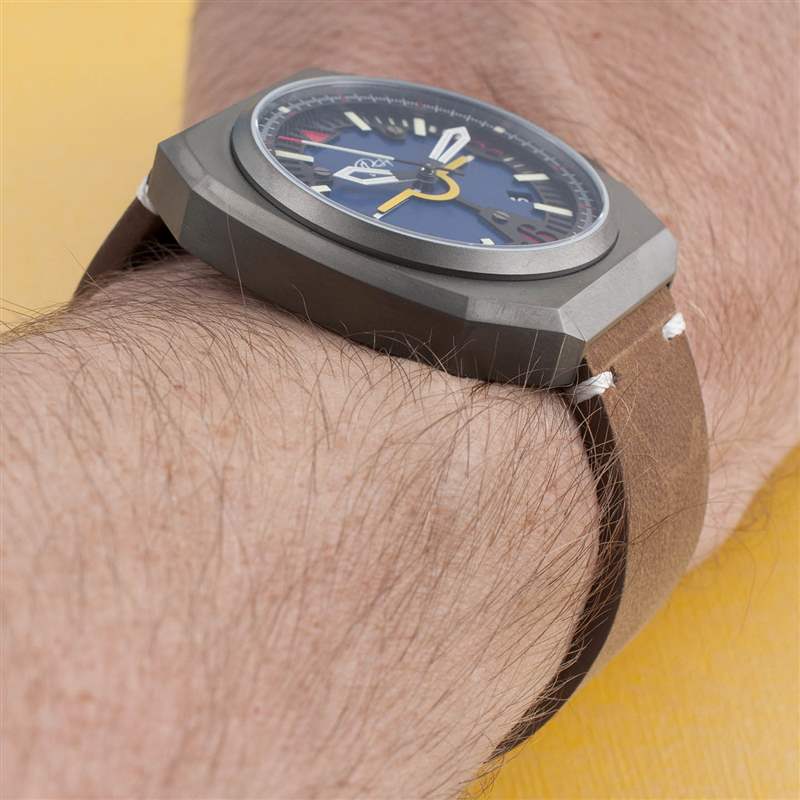 這款手表的名字來源于飛機上的姿態(tài)計(不要與高度混淆),指示飛機相對于地平線的方向。雖然靈感顯而易見,但它很微妙,不會打在你臉上,也不會讓人感覺像是在向 Bell & Ross 致敬。帶有藍色 AR 涂層的藍寶石水晶玻璃使表盤清晰可見。廣告留言廣告信息結(jié)束